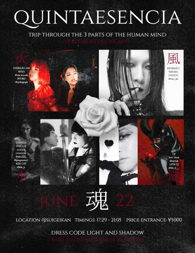 Then we see us again in BAR La Vie en Rose. The performative narrative of Quintaesencia in Japan flowed starting between Vogue, and costume traditional kimono changes with an erotic-fetishist vision by Alice and Gongon, the mystical, ritual dance of Kiki Cat, the musical strength of Ray Trak and Lith Li and the emotional intensity of shibari SM by Rika and Ryoko—exploring fire as trauma and resilience. The climax came with the shibari Kinbaku performance of Wataru Shindo shibari artist and Lith Li, a poetic and painful journey toward liberation, accompanied by music ranging from Memoirs of a Geisha to Die Form, Blade Runner, and Hooverphonic for the burst into petals. Quintaesencia is a journey through the 3 parts of the human mind, Art, and Unity. Quintaesencia and its Map (photo): the conscious (white), the subconscious (red), and the unconscious (black). Through this chromatic symbolism, the experience invites reflection on contemporary society, bridging past and present in a living dialogue between art and soul. In its edition at Suigeikan, Japan, the path took the form of the four natural elements: music, dance, fashion, and shibari—expressions guiding the audience from innocence and traditional femininity to hypersexuality, trauma, and resilience. It was an act of creative liberation where each soul could express itself in unity, revealing that we are more alike than we imagine.