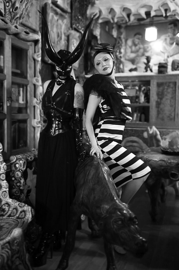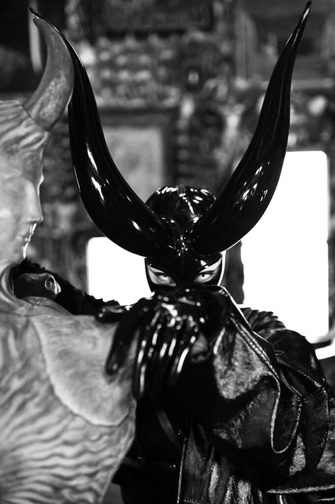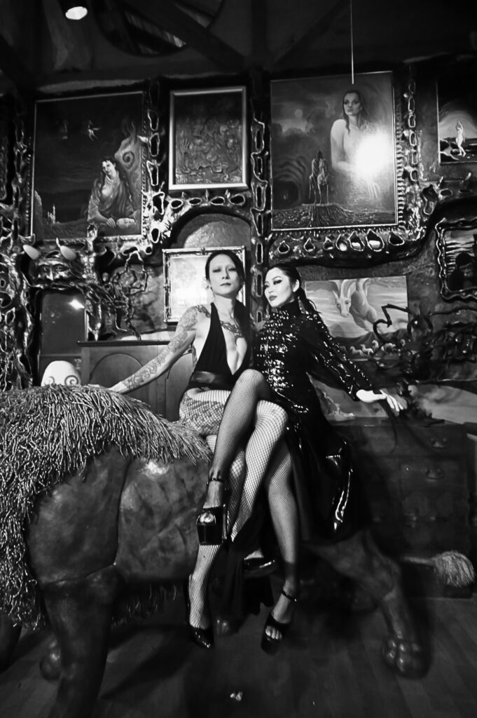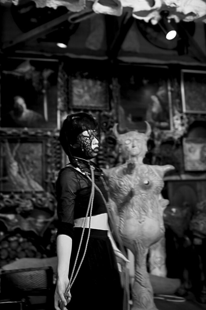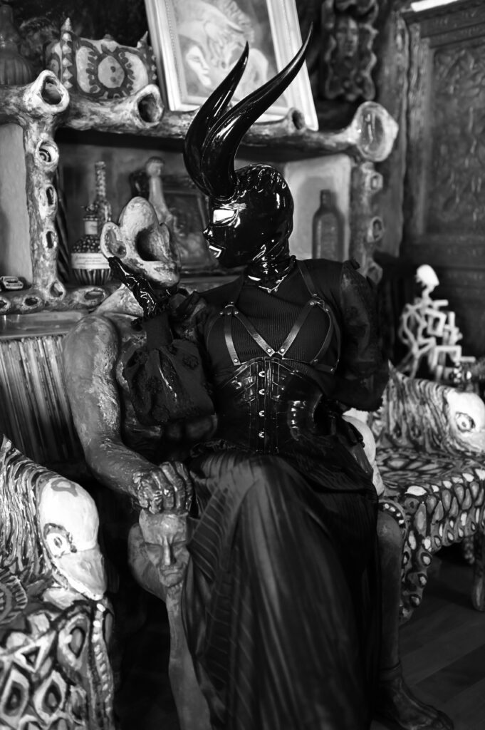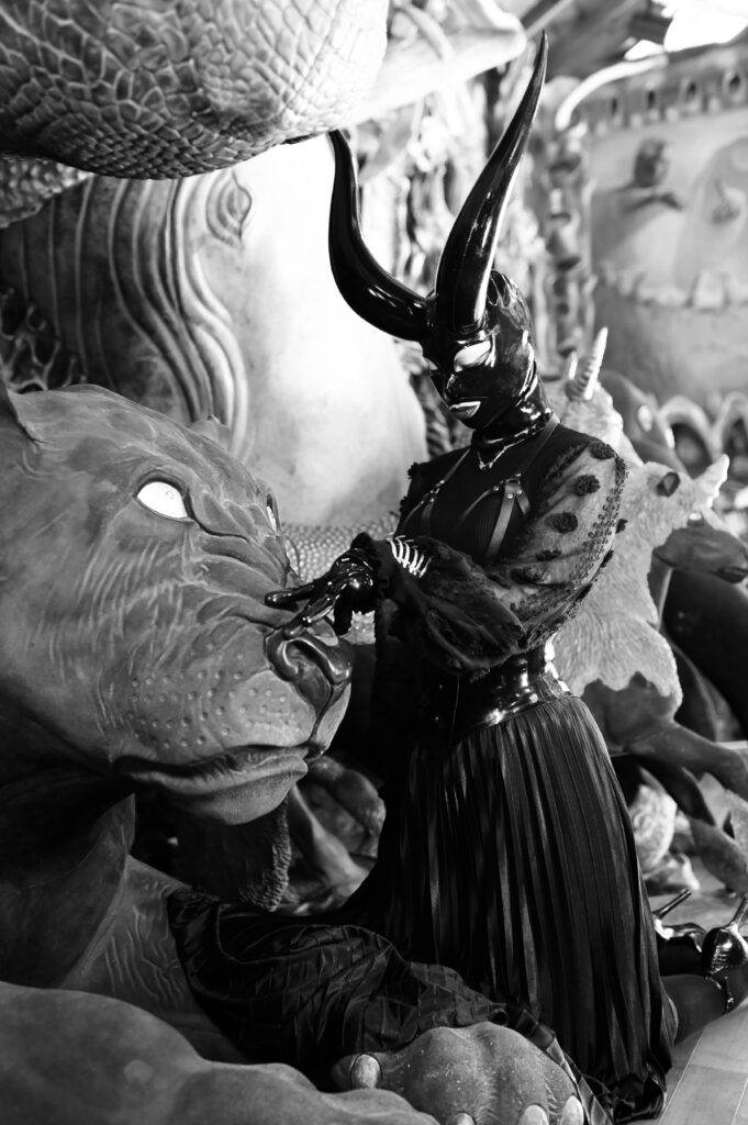 The journey began with Wataru Shindo @ruco_inc , with a majestic Visual Kei look, (ヴィジュアル系) in its most elegant form taking control of Lith Li @lith_li_____ with his demonic and iconic aesthetic—dressed in latex, corset, long black dress and masked—posing in various positions in front of that Japanese figure, half-demon and half-woman (which I mentioned at the beginning of the interview) from Suigeikan itself. This figure served as a totem for the model, Lith Li, to avoid getting lost in her stormy, nostalgic, and romantic thoughts, where the truth remained hidden.