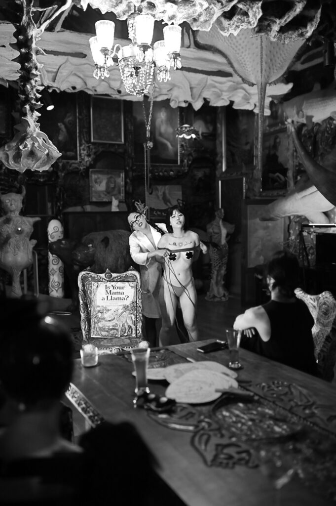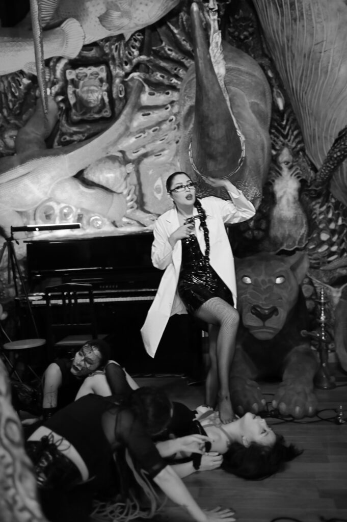 GONGON; She shapes emotions, hazes, and unspoken thoughts through her body and visual expression. With respect and pride in Japanese culture—such as the concept of Wabi-Sabi—she creates works that are not flashy, but instead carefully evoke the quiet intensity of a fever burning within. Gongon, Kiki Cat and Alice shaped in Quintaesencia the element of water through Vogue & dance as the beginning of the ritual. They moved with traditional Japanese kimonos and then broke into a radical shift with voguing movements and latex outfit changes—an erotic and fetish vision that expressed duality within womanhood. Kiki Cat narrated an esoteric, mystical dance in a mysterious and daring version, approaching the audience from the hidden into the visible.