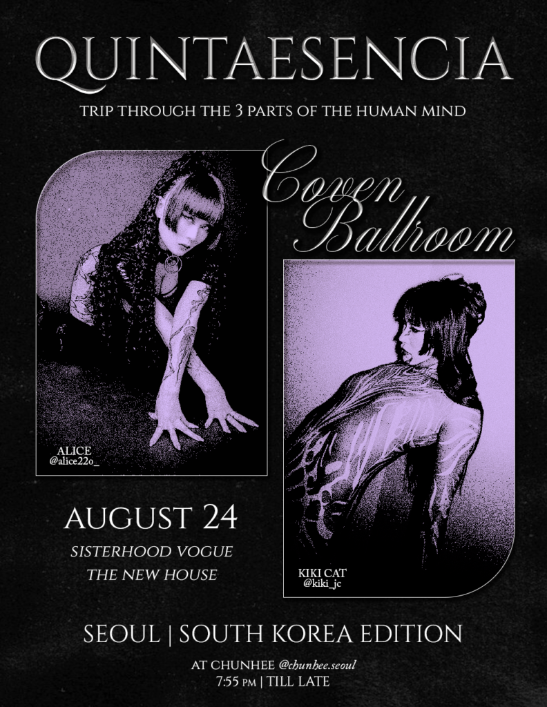 The seventh edition took place on August 24th, at the same venue in Seoul. This edition focused on the theme of sisterhood through Vogue dance, titled “COVEN BALLROOM: The New House,” exploring its origins, empowerment, the figure of the Mother, and a house of artists where, through a bit of magic, we can unite and bring forth a more just analysis of the present moment. Artistically, the lineup included Kiki Cat and Alice who flew in from Japan, who performed in Korea through Vogue, pole dance, LED hoops, and ritualistic dance, inviting reflection on the state of society. The goal was to dance it and create a solid Coven. The audience in Korea was very appreciative, and we were thrilled to connect souls and art once again. The next edition will take place on September 19th in Barcelona, Spain. The movement always tries to focus on Quintaesencia as a free space, and for this reason, we bring it internationally to different parts of the world, connecting souls who are aligned mentally, morally, and respectfully with the energy we cultivate. We will hold the eighth edition with “Dames sur les Decks,”and we have future editions planned in the USA—Los Angeles (for november) and Miami (for december) this year, which we will detail soon. We are very happy to see Quintaesencia continue to grow from the same understanding, in correlation with mind, body, and soul.