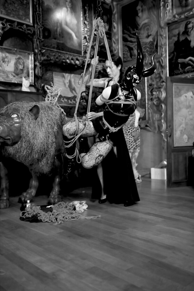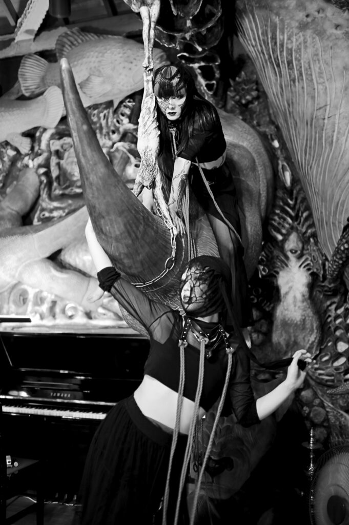 Afterward,  RAY TRAK @raytrak enveloped the space through the element earth, weaving in different musical references with his majestic aesthetic presence. Ray Trak has been present at countless events as a DJ; iconic and unique. I first met him at The CatCave in Shibuya, Tokyo. Rika and Ryoko, through the Japanese art of Shibari SM, spoke to us of trauma and resilience through the element of fire. It was a high-voltage act, both visually and emotionally. The performance carried us from innocence to its loss, in a theatrical atmosphere where each of the earlier performers’ acts took on deeper meaning—feeding into Ryoko’s introspective vision as the submissive part, and Rika’s as the dominant part—together forming a whole, a story many of us could see reflected in our own childhood or youth. To conclude the Trip-story, it ends in an outburst of petals, like the ultimate purity of the human soul, with Lith Li as shibari model and Wataru Shindo as the shibari Kinbaku artist.