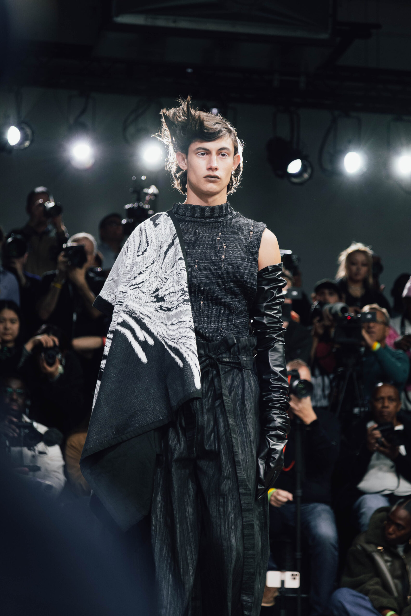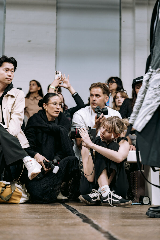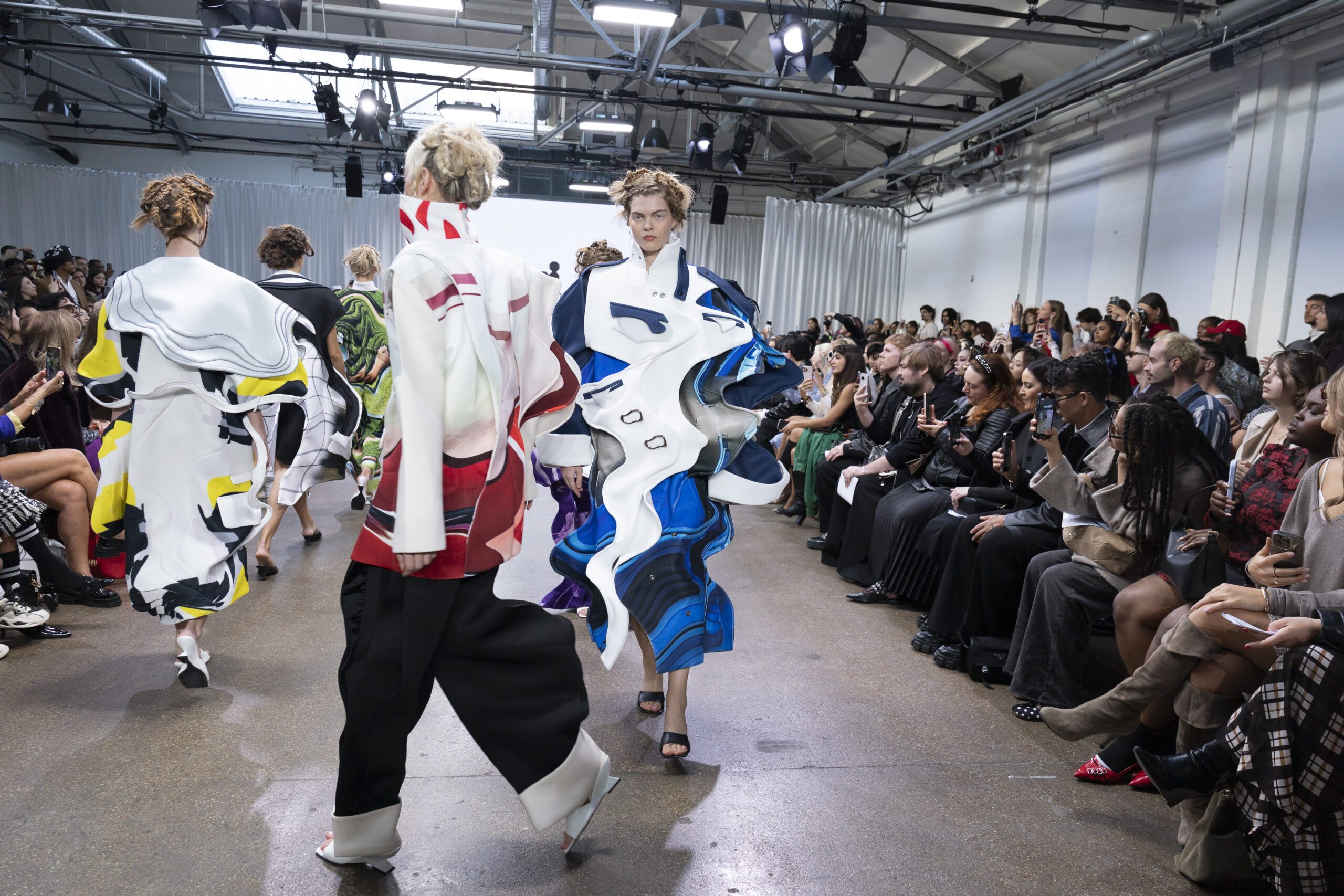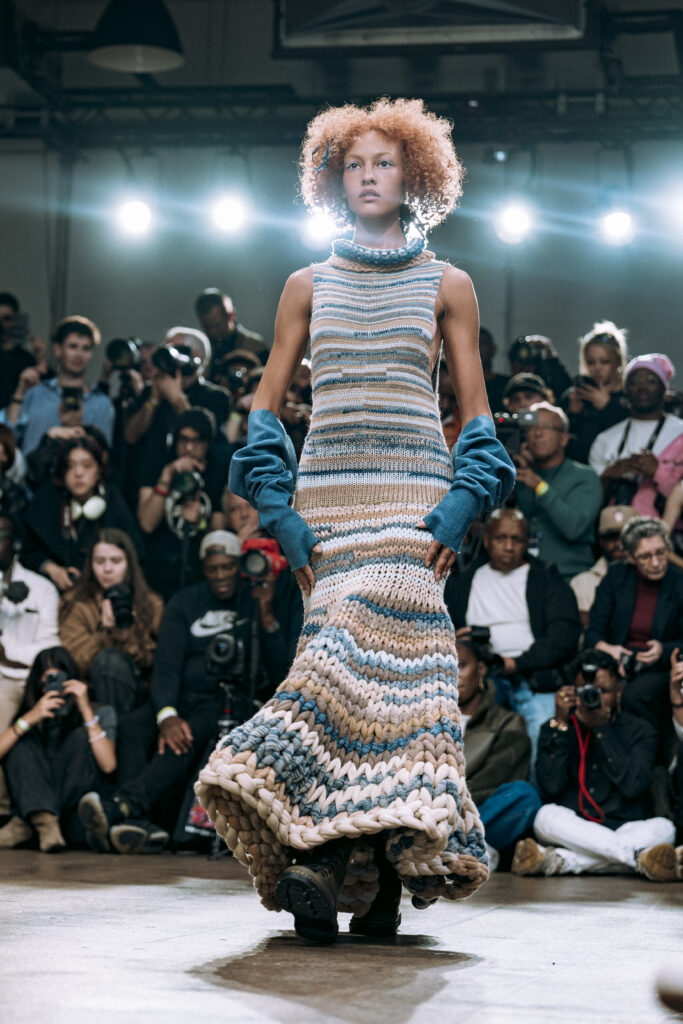 Ying Chu, now based in London, drew from Taiwanese cultural rituals with Liminal Forms. Exploring the soul’s passage after death, the collection shifted between presence and absence with gradients of black, grey, and white. Each piece became a tactile narrative of loss, transition, and rebirth.