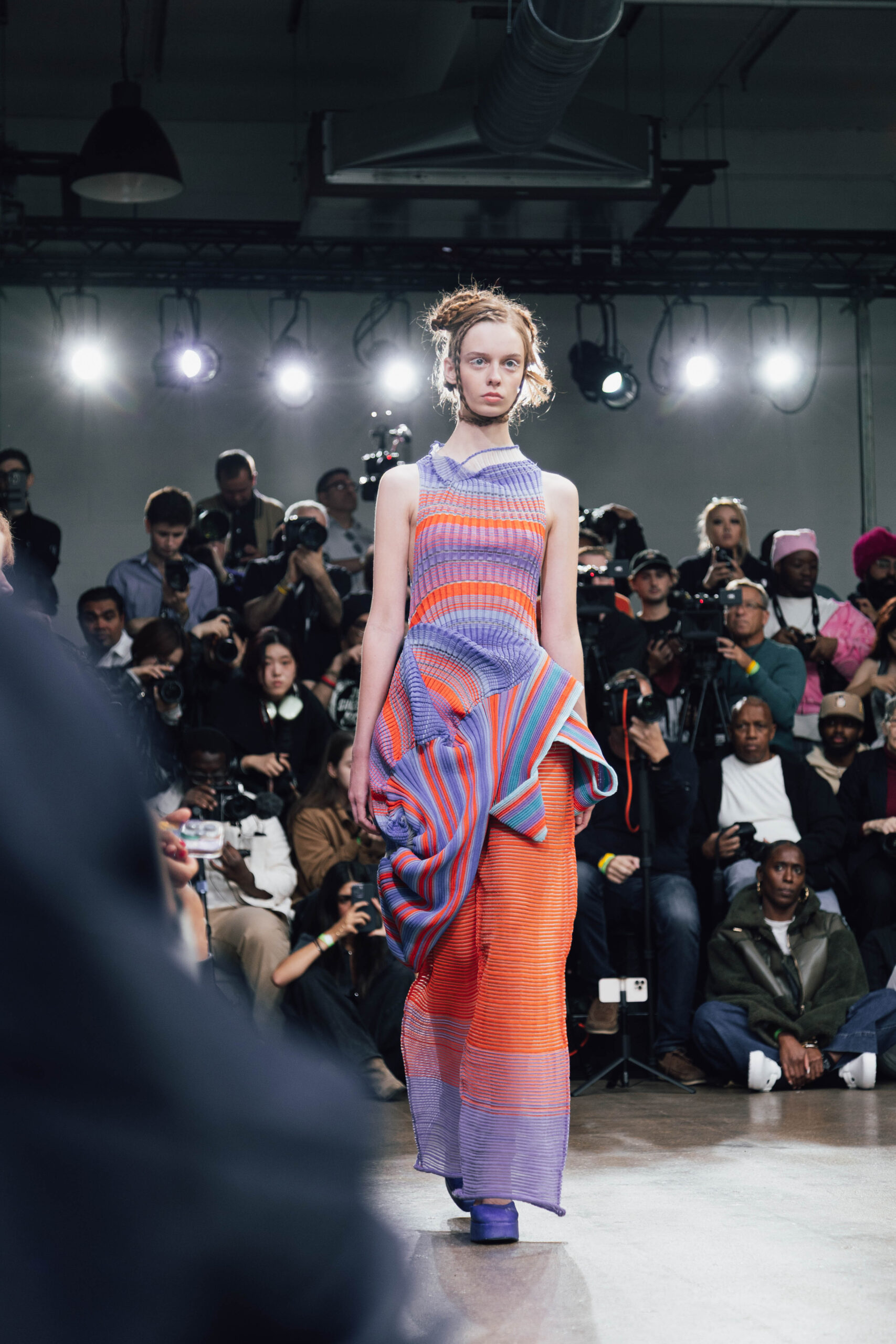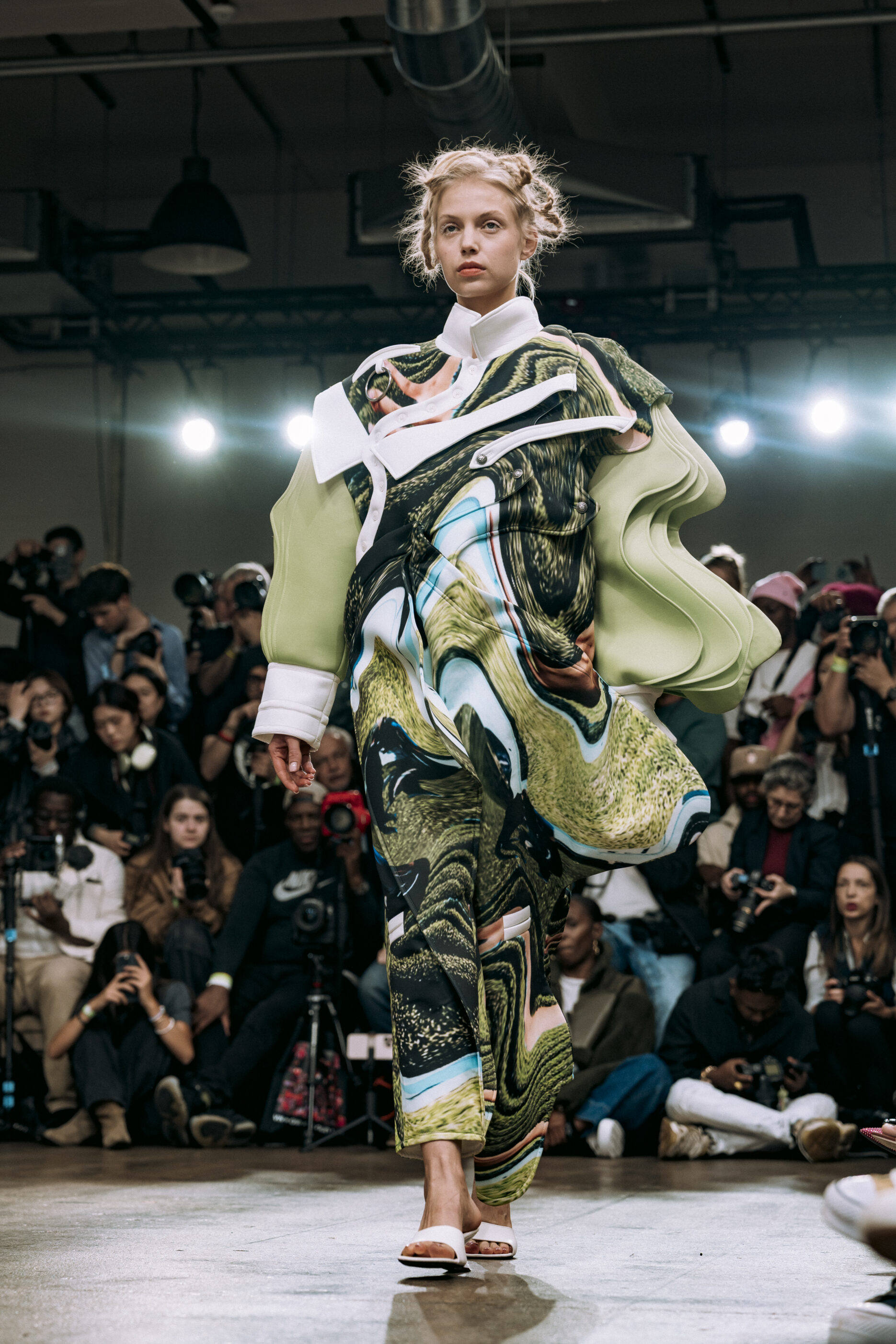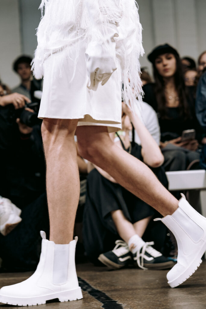 Ying Chu, now based in London, drew from Taiwanese cultural rituals with Liminal Forms. Exploring the soul’s passage after death, the collection shifted between presence and absence with gradients of black, grey, and white. Each piece became a tactile narrative of loss, transition, and rebirth.