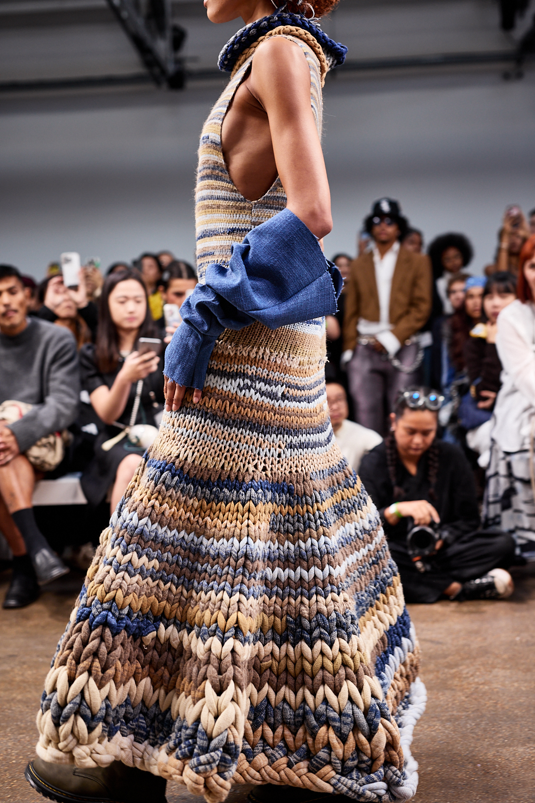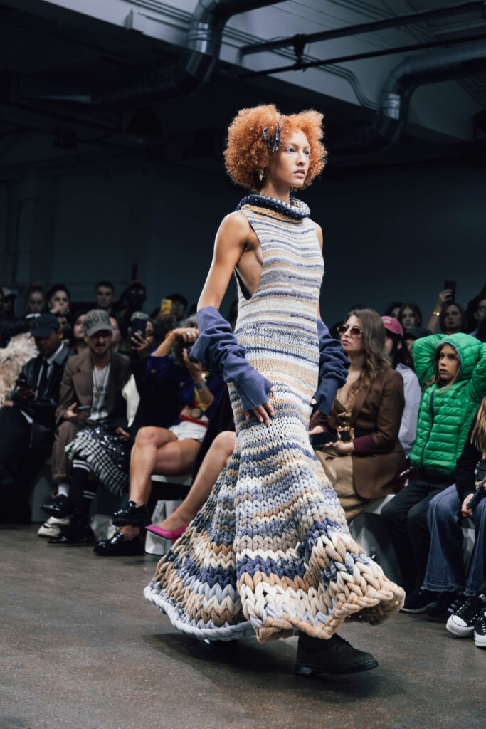 Designer Chih-Wen Kuo transformed knitting into a metaphorical language with Sedimentation. Each stitch represented memory and time, creating intricate landscapes of layered deposits. SO the result was knitwear that felt both sculptural and intimate, drawing on the ancient tradition of knotted cords as records of history.