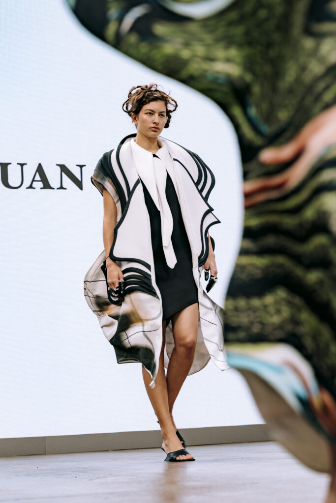 Juan-Juan Xu presented Inter-Shadow, a collection inspired by human connection and distance. Through shifting silhouettes and evolving patterns. Xu visualised the tension of interpersonal dynamics, urging a return to authenticity in human relationships.