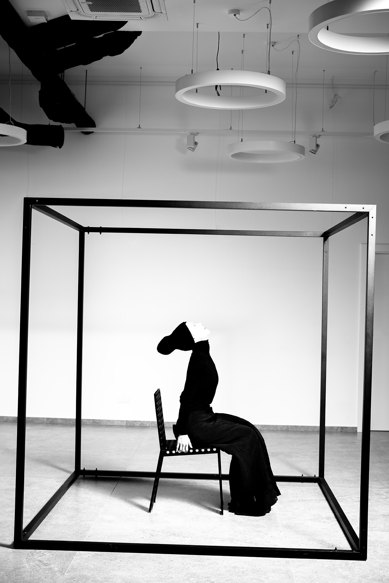 Premiered at Berlin Fashion Week, the “ABSOLUTE” act is now placed at the conceptual Jaga Hupało Space of Creationin Warsaw and attributed with objects by local design visionaries, Zieta Studio, Anna Drozd-Tutaj, and Organic Lighting. At the centre stage, framed with a cube construction, stands a chair, as a starting point for a profound insight. Instead of music, Irina Dzhus tells her story. Link by link, she unveils a sequence of events, dialogues and sensations that have led her to the agonising animation of unexperienced absolute happiness. The silhouettes are naïvely structured as Irina Dzhus refers to modernist comics and spiritualistic motifs. She freezes her memories within transformable outfits, replaying them in a loop mode.
