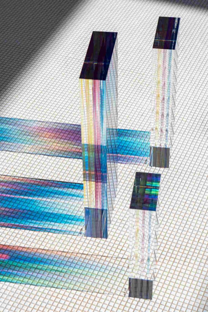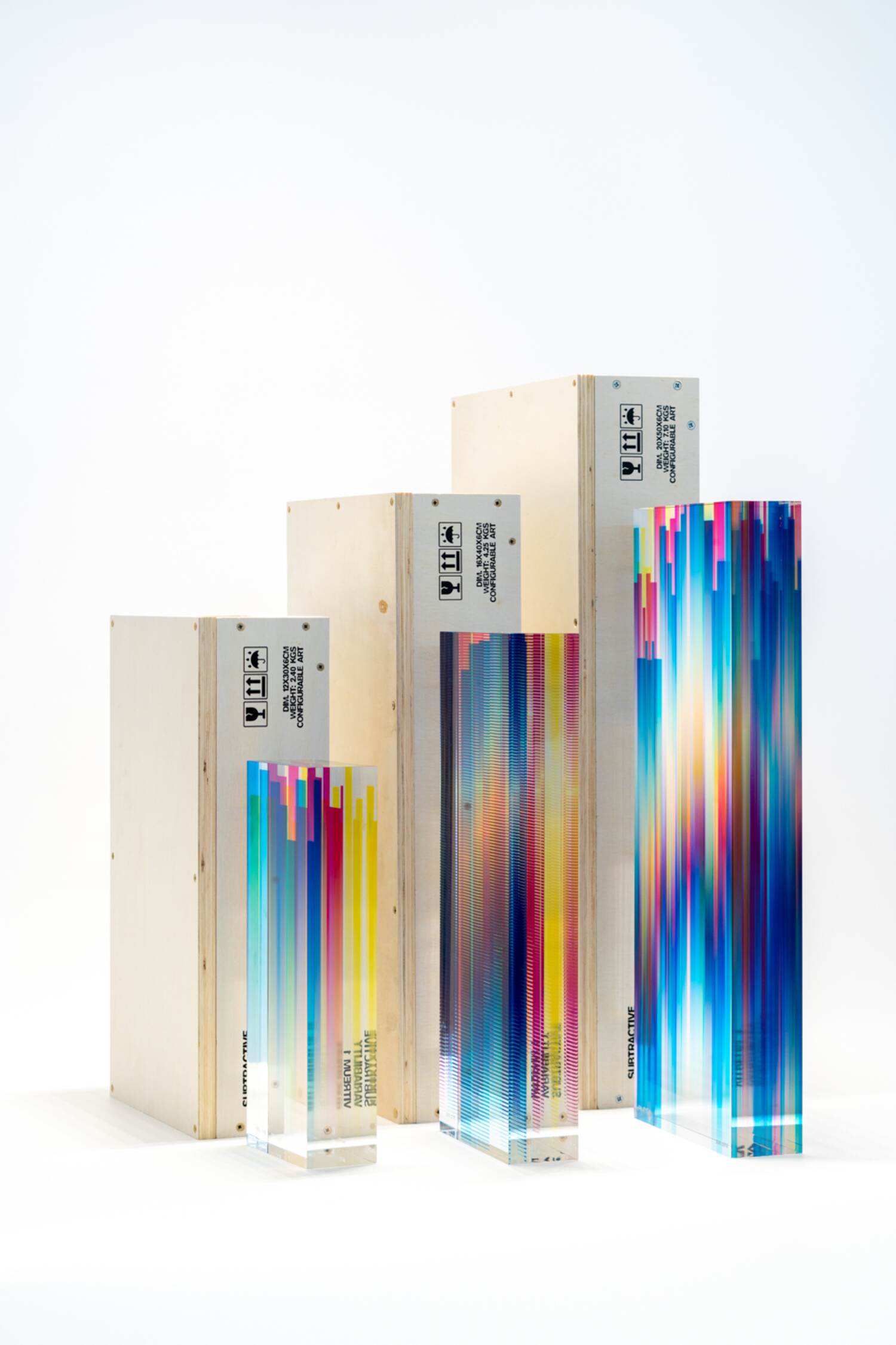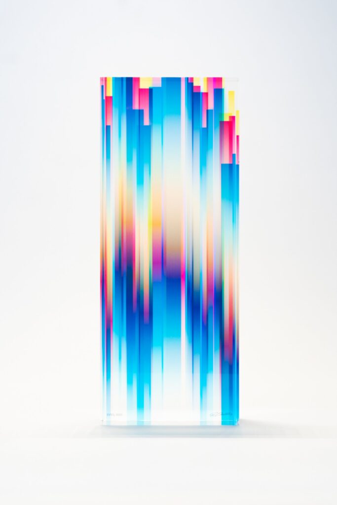 Within a solid resin prism, three translucent layers of subtractive color: cyan, magenta, and yellow, float in suspended harmony. Each layer interacts optically with the others, generating infinite chromatic possibilities that unfold as your viewpoint changes. The Name Vitrium recalls the idea of glass, a capsule and a vessel of perception where color and light are preserved, yet alive through their interaction. In this piece, the phenomenon of subtractive variability is no longer just observed on a surface; it becomes encased, spatial and sculptural, transforming as the viewer moves around it. A permanent object that contains perpetual change.