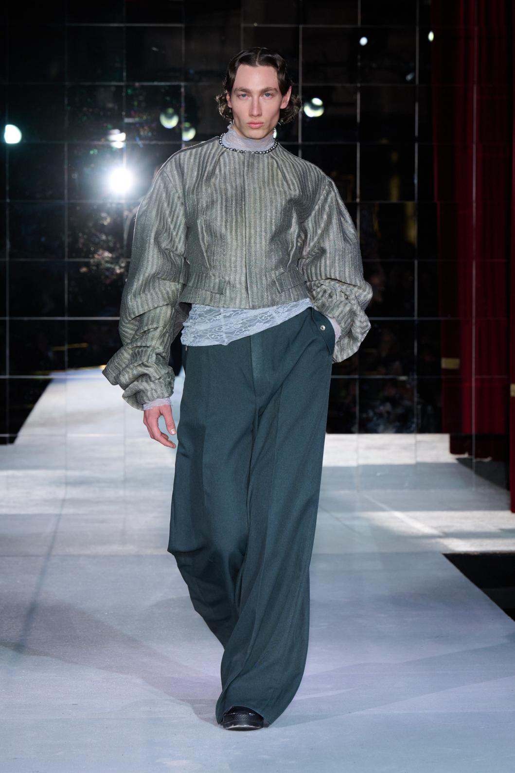 HADERLUMP’s AW26 show marked a clear shift from previous seasons. Velvet curtains and a mirrored stage framed the Varieté space. Models moved slowly and deliberately. The finale, set to a string ensemble, ended in a striking tableau.
