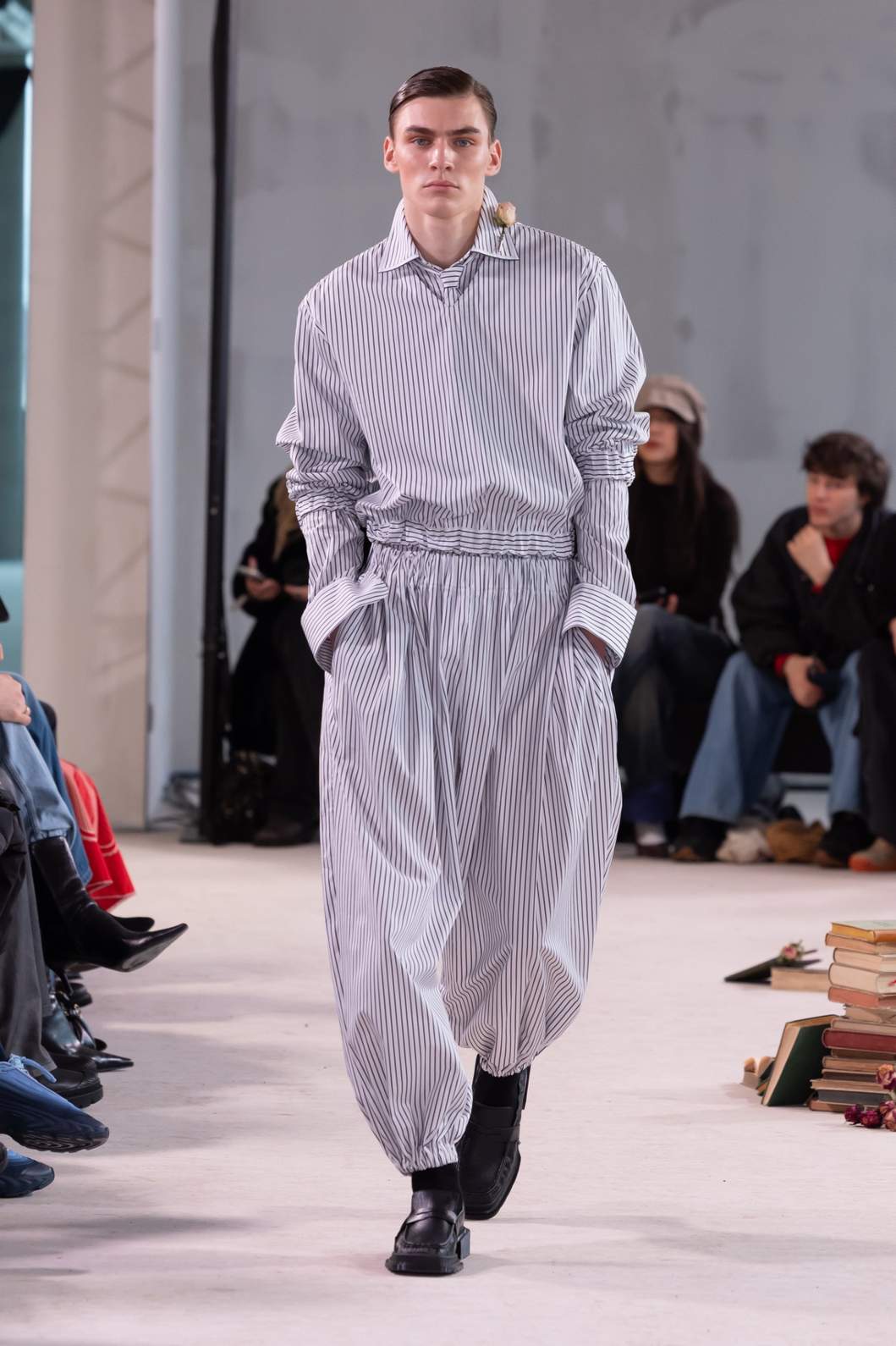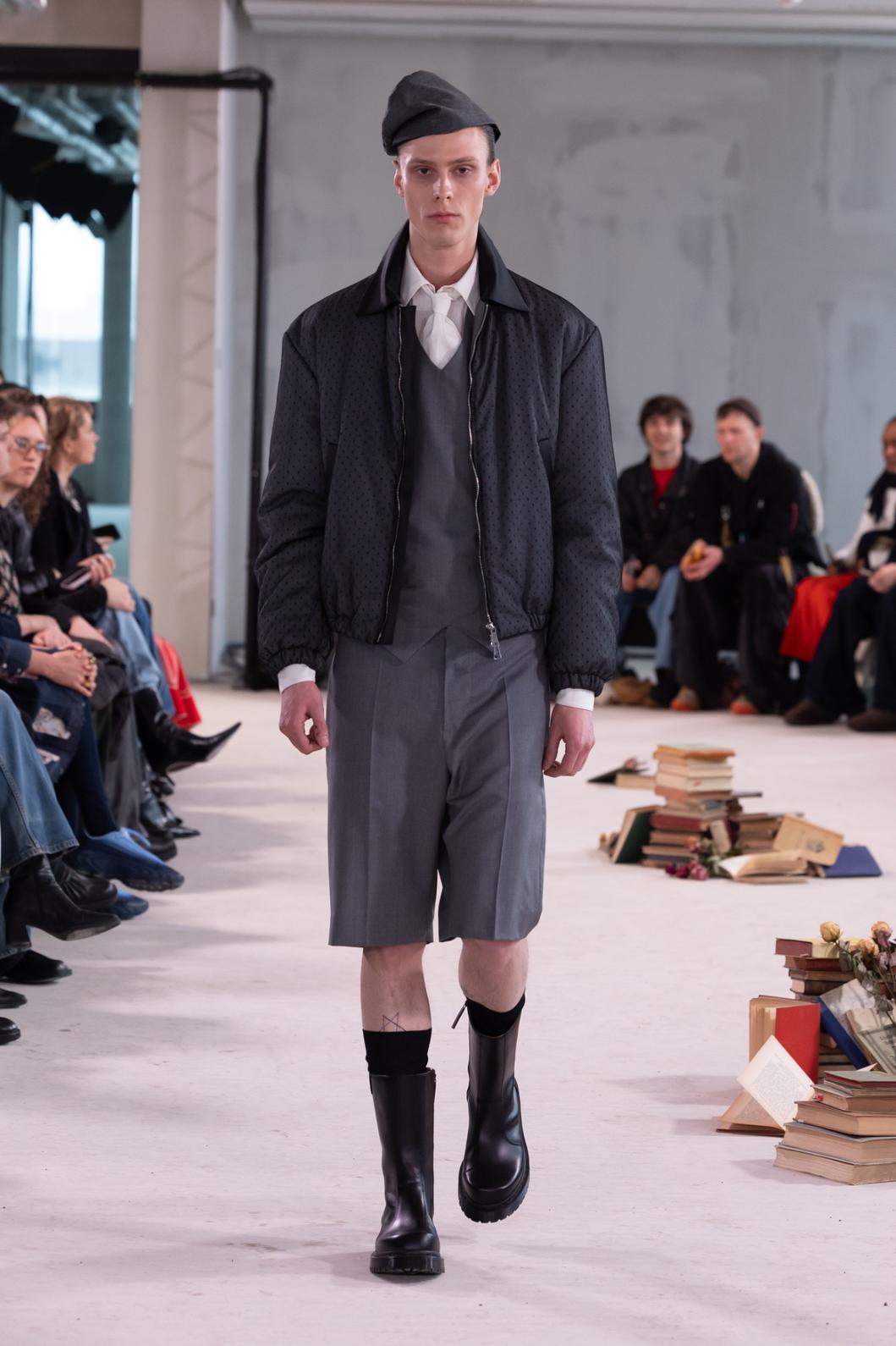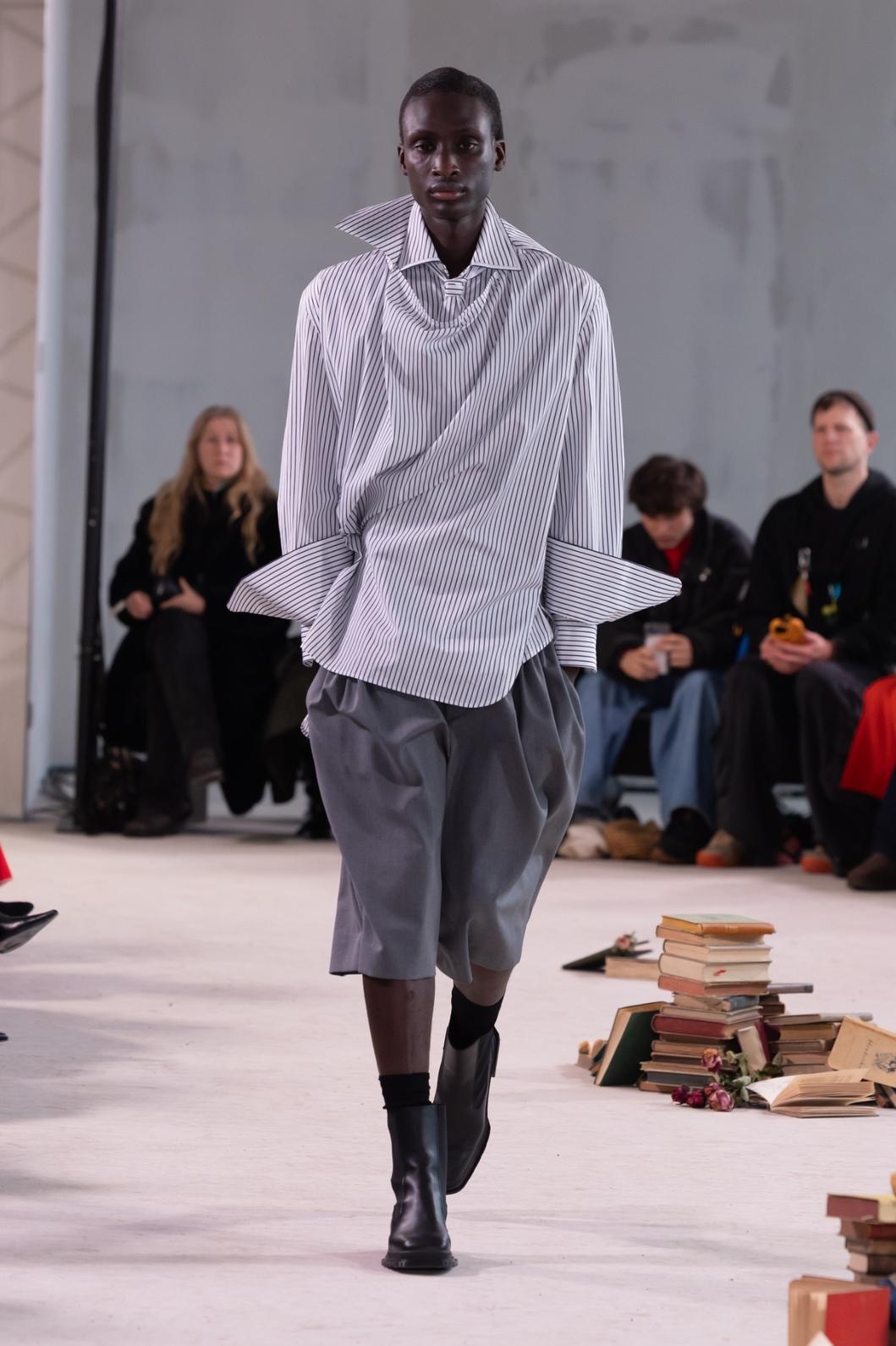 These tensions and unrest are clearly visible in the collection. Classical corporate menswear is fused with motifs of late Rococo decadence. Tulle overlays, veils and dried flowers appear as symbols of withering beauty and fading excess.