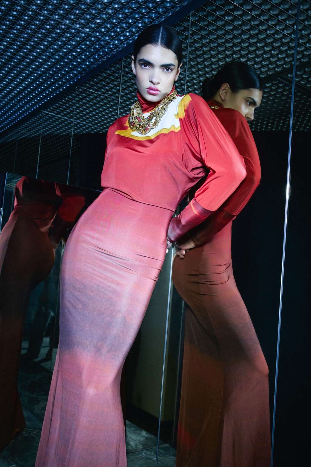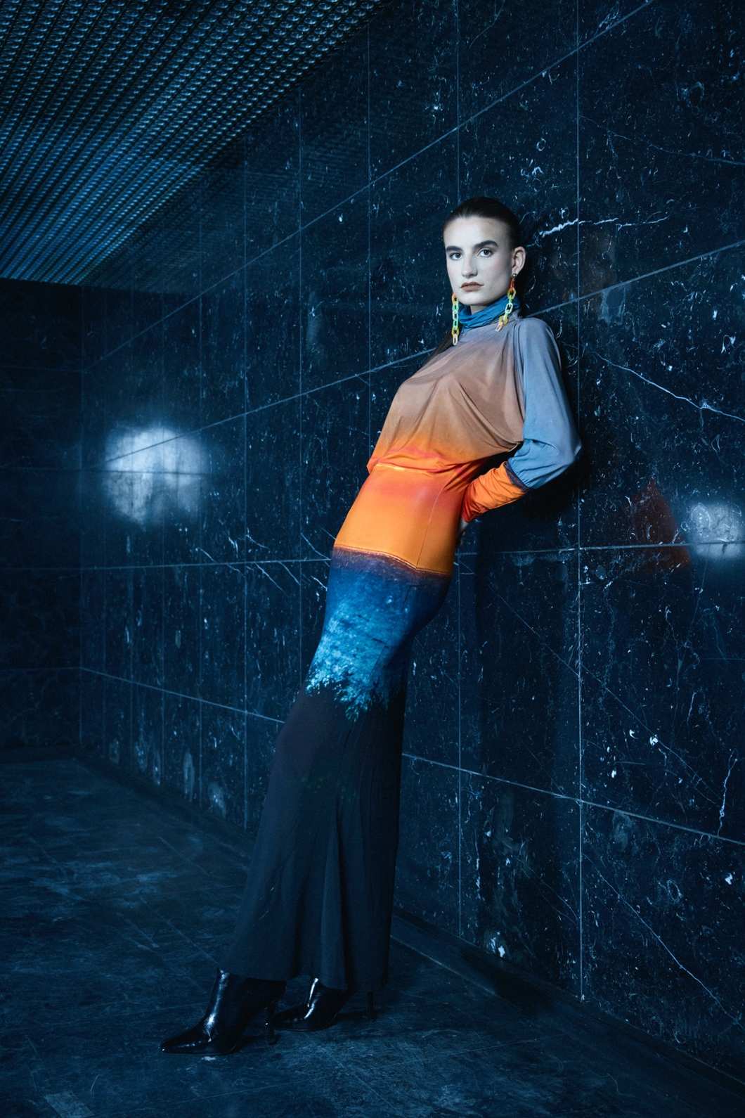At the heart of the collection are prints developed directly from the taken photographs. Deep shades of blue, a glowing sunset, graphically abstracted natural stone, and retro-inspired oversized checks merge into a fashion language that combines elegance with a touch of modern streetwear—ideal for confident evening appearances. Cocktail fashion, interpreted for everyday wear. Ostertag and his team design looks that become true companions in life. Versatile to combine, effortless to style, and yet unmistakably special.