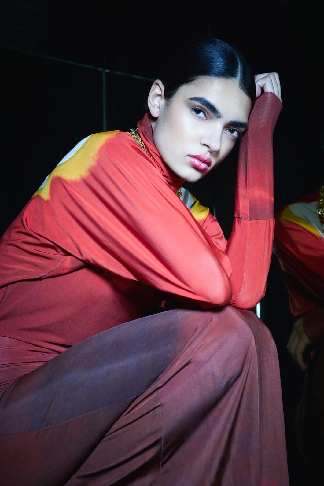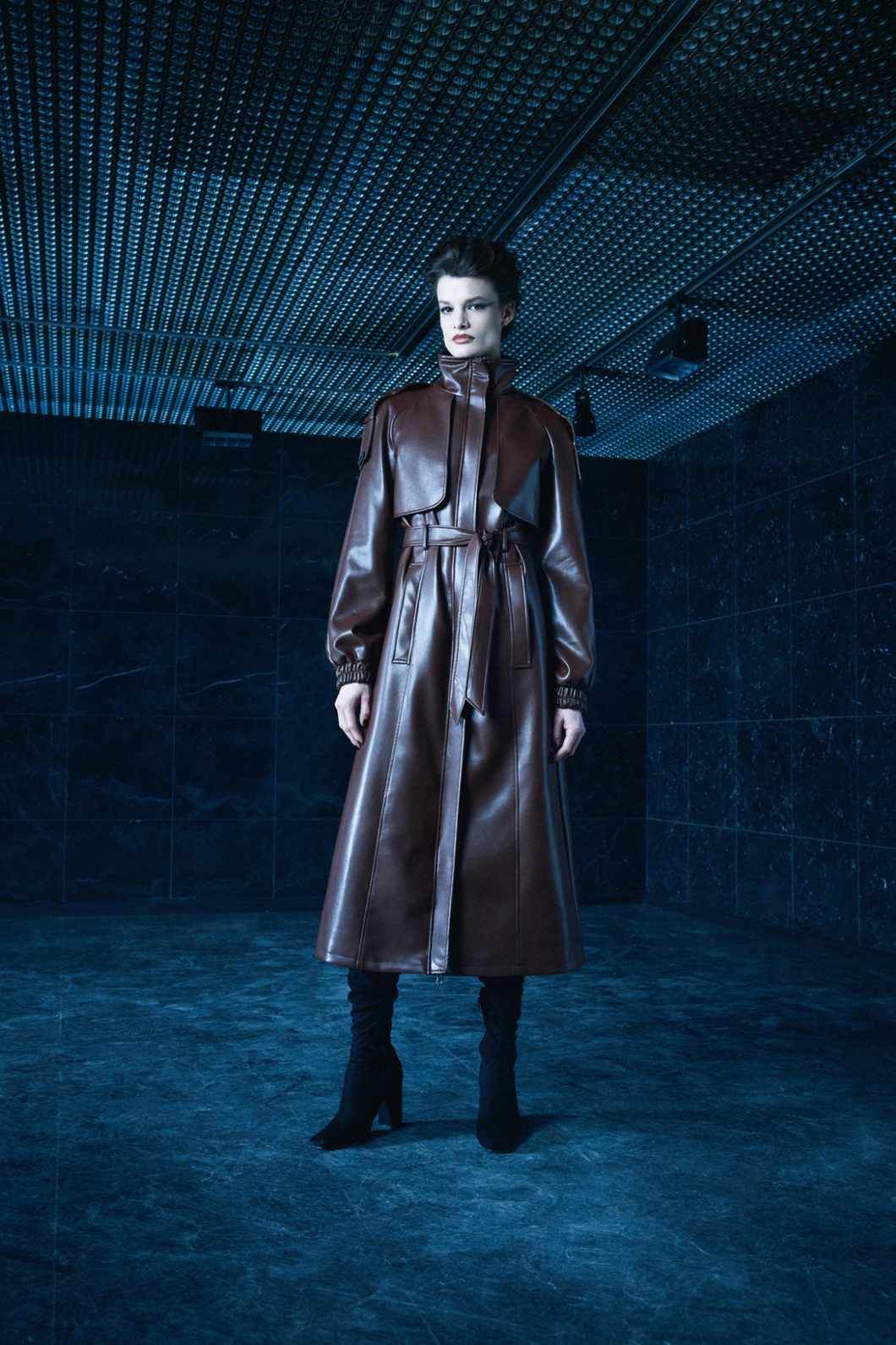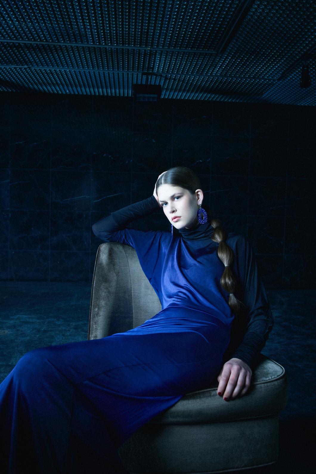 To complement the intense blue tones, Marcel introduces accents in mandarin, copper, mint, off-white, black, and various shades of grey. Marble effects add extra radiance to the colors. Long, printed dresses made from flowing jersey fabrics gently embrace the silhouette and are paired with hand-knitted maxi scarves. Power coats with clean lines meet delicate chiffon or slim skirts. Strong shoulders are conveying presence, while the waist is visually emphasized—a powerful, feminine look.