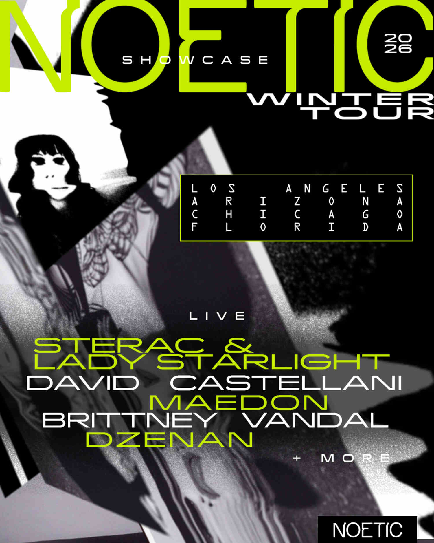 Additional artists across the tour include live acts Komprezzor, known for his dark, machine-driven Chicago techno; Trovarsi, who blends analogue synths, modular and drum machines for hybrid live sets; and Sleepy Cat, a Los Angeles-based underground house and techno performer, alongside DJs such as Dzenan, a groove-focused DJ and founder of the Fader series; GERSH, a key member of Phoenix’s Departures crew; and Brittney Vandal a Lisbon-based hypnotic techno DJ and poet.