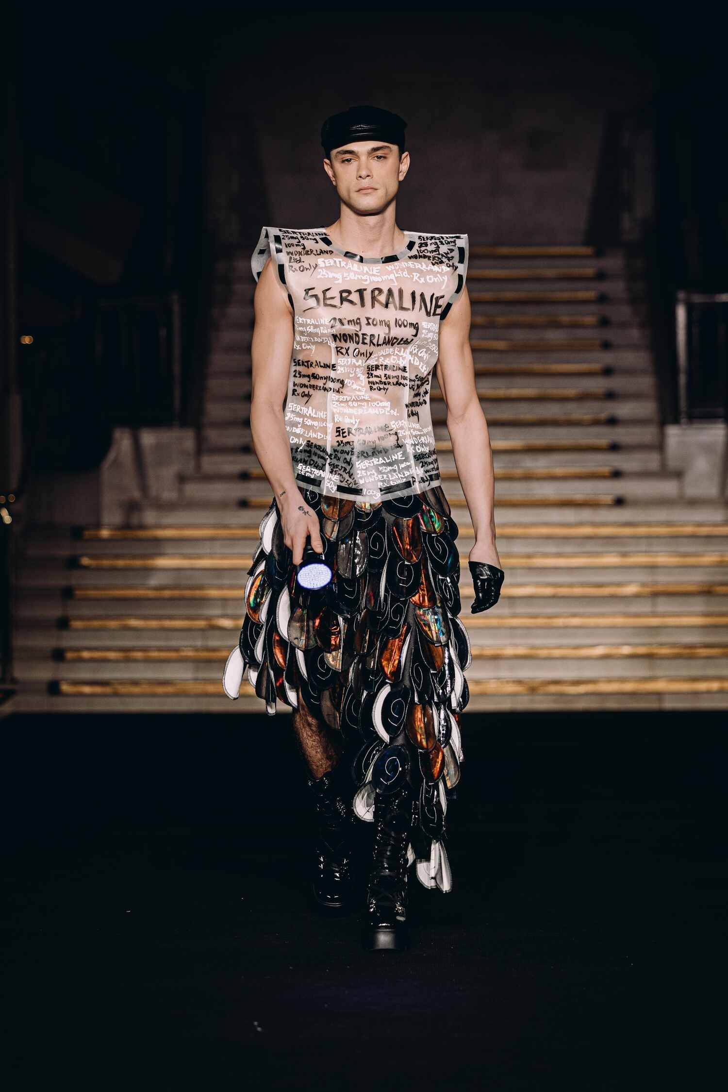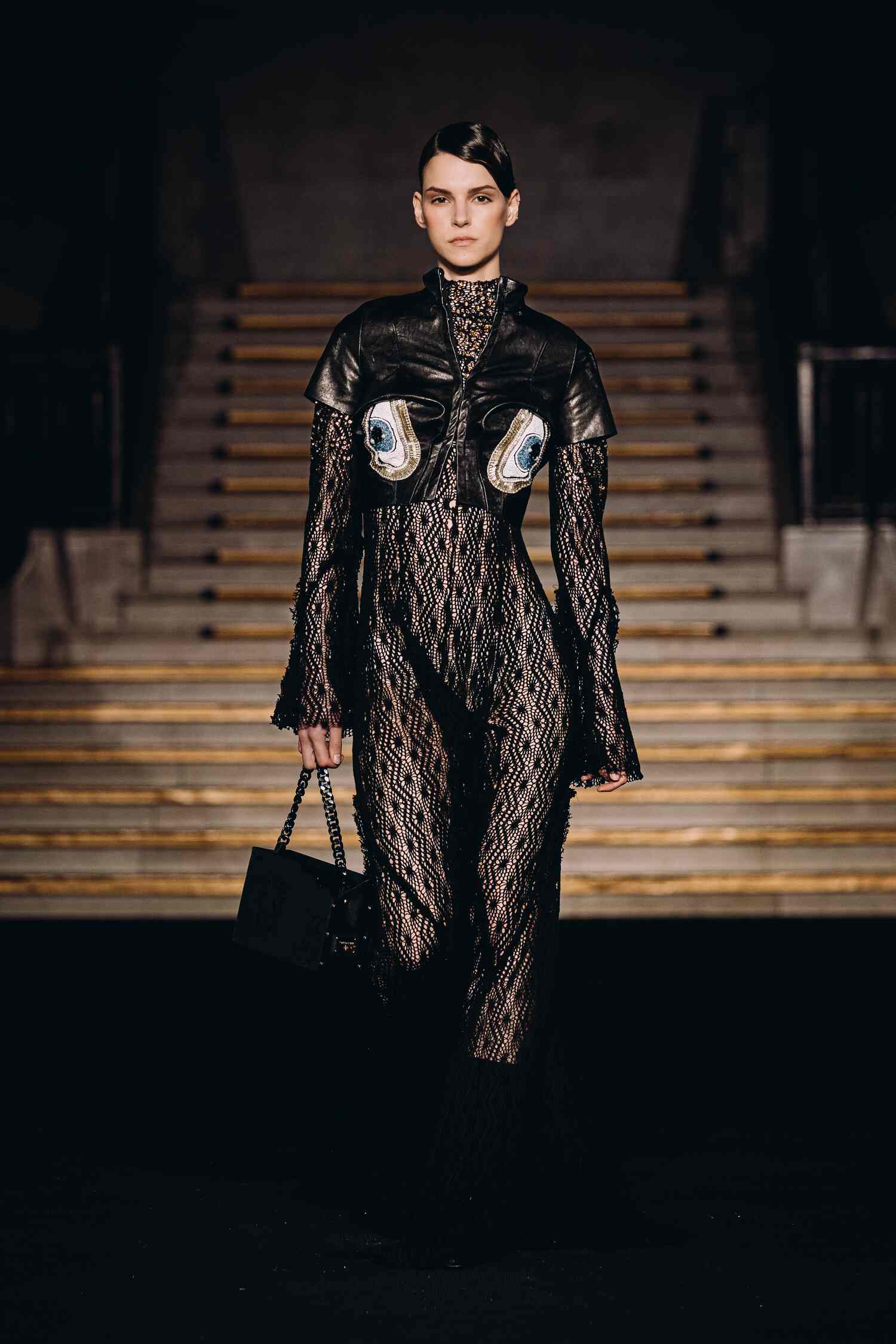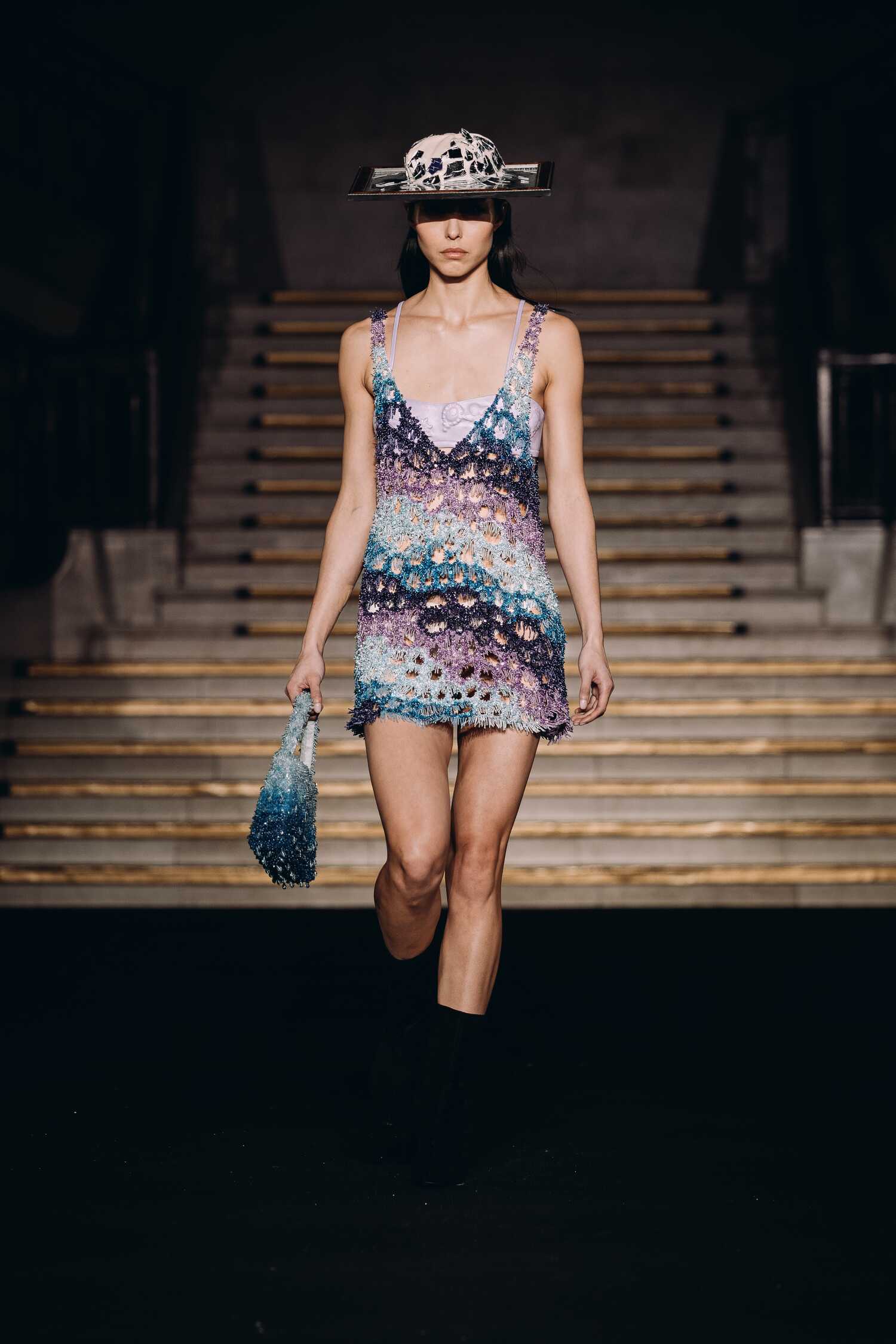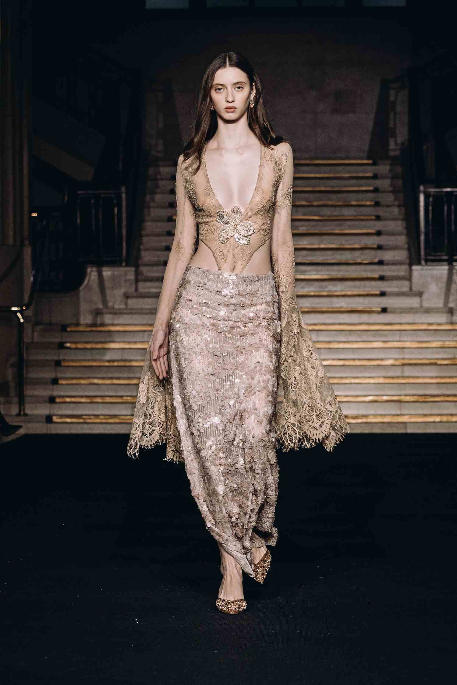 The collection centers on the corset, using sequins and light-shifting prints to highlight its structural beauty.