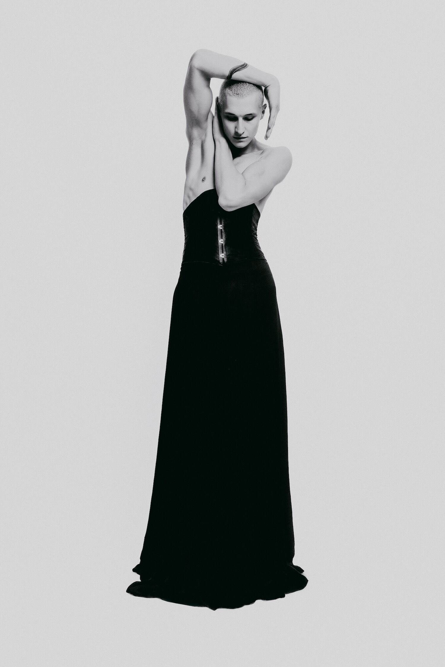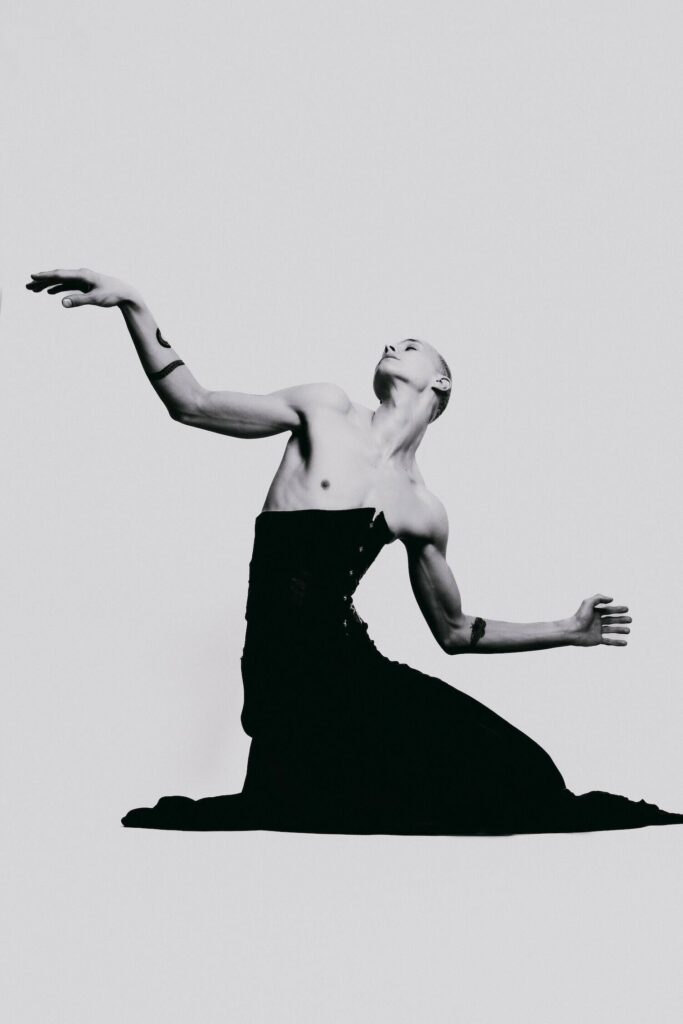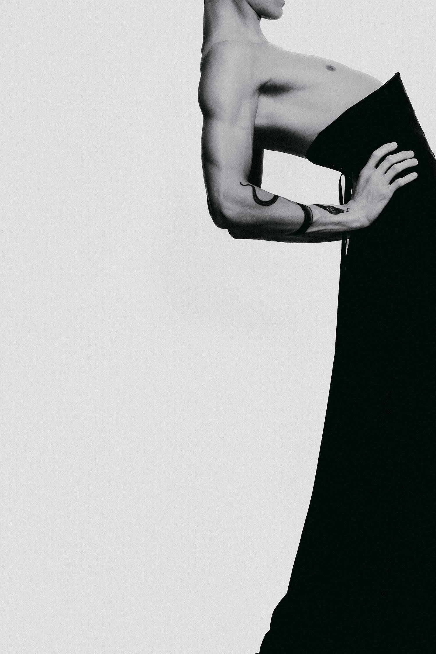 The Contour of Presence. Quiet elegance bends the frame. Not fragile, but controlled force wrapped in velvet tension. Softness strikes like pressure, not retreat. Monochrome burns with contrast: bone and steel, light against weight. A charged border between worlds, where power flexes instead of shouting.