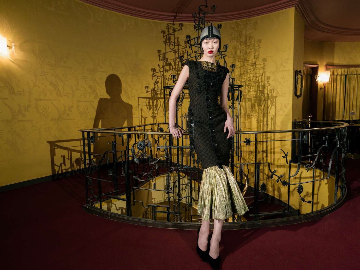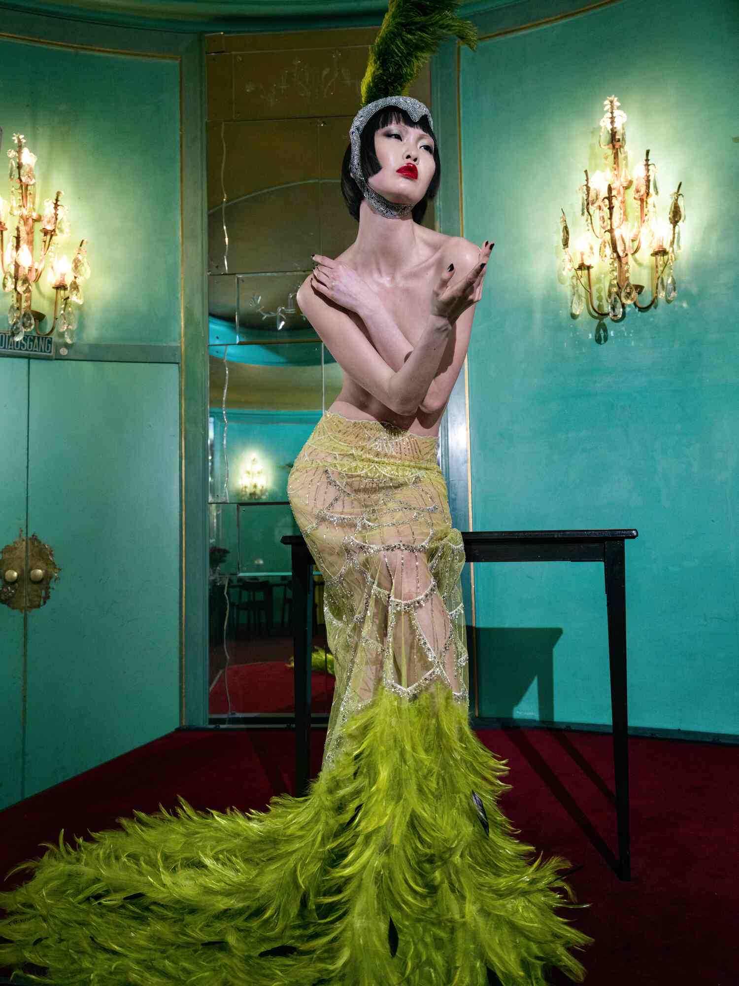 Sustainability remains at the heart of the brands process. The team sources dead-stock silk, vintage garments and rare materials from a recently closed costume house, transforming them into one of a kind designs. Feathered details, corsetry and intricate beadwork elevate the collection.