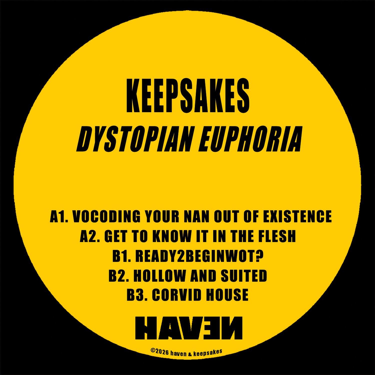 HAVEN co-founder Keepsakes returns to his home imprint with Dystopian Euphoria, a five-track EP set for release on April 10, 2026. Known for his uncompromising productions and distinctive sonic identity, the artist continues to push the boundaries of club music with a record that is both intense and playfully unorthodox.