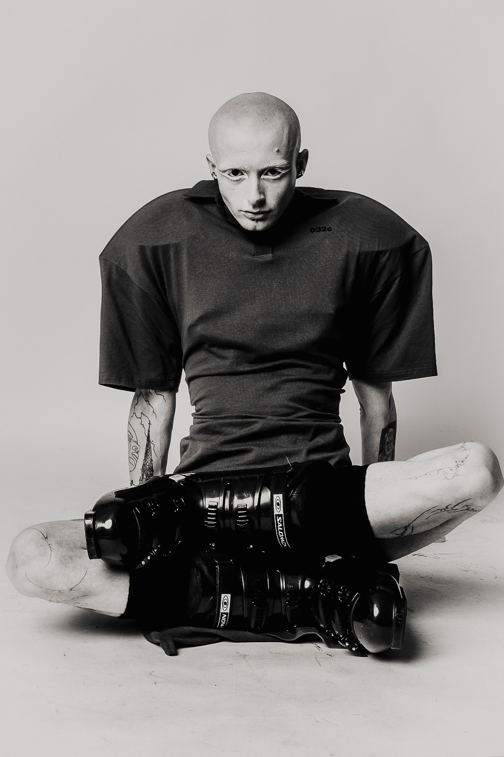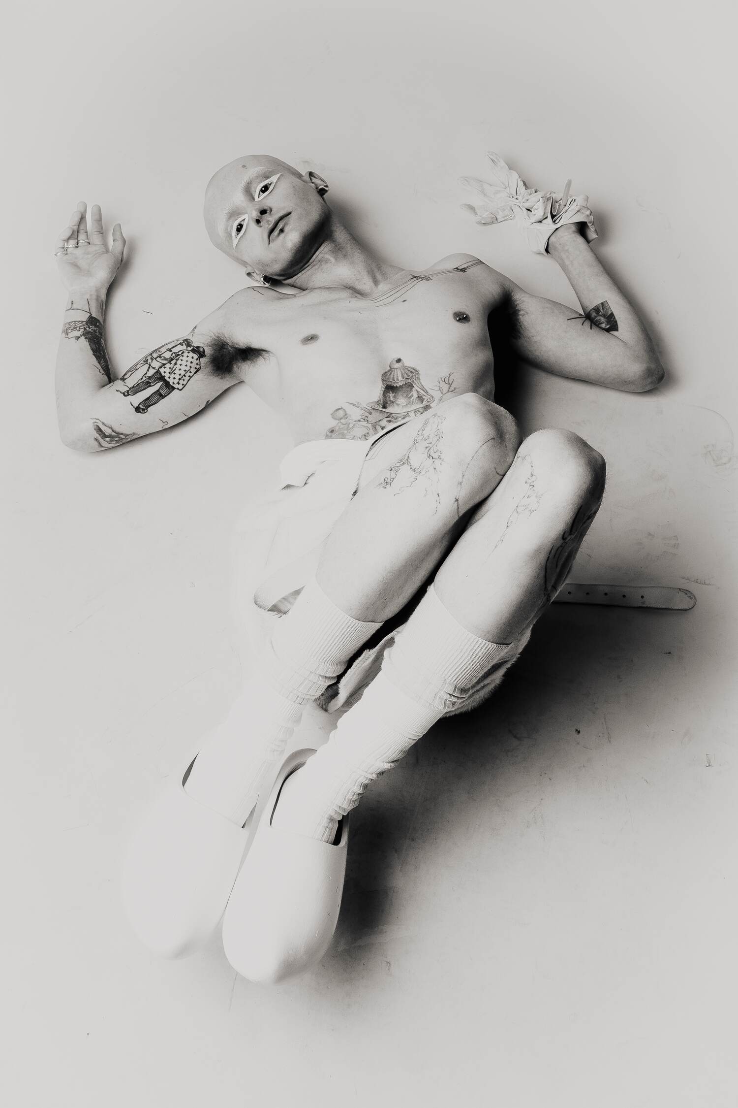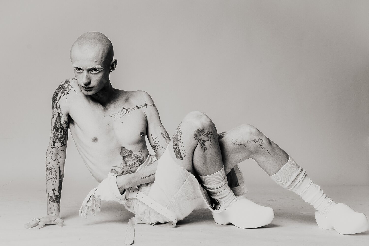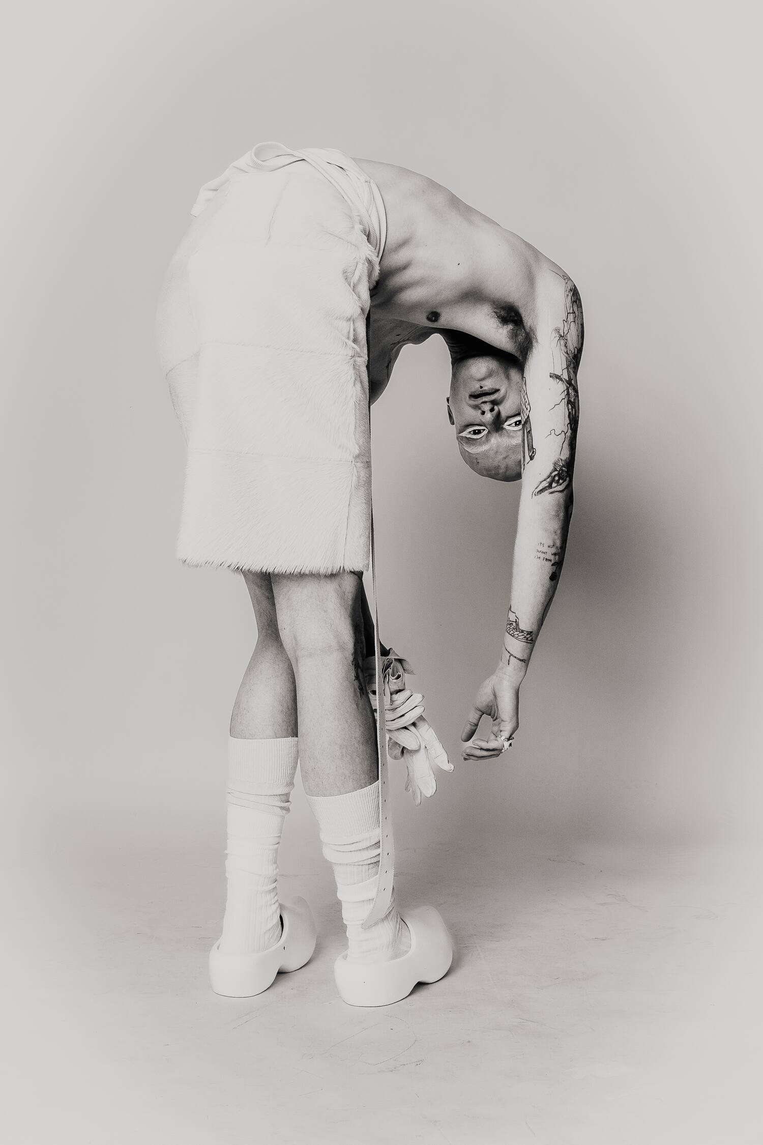 Shot against a neural studio backdrop, the series focuses on only on the body itself: tattooed, costumed, contorted, exposed. The models move through shifting states of vulnerability and power as fixed ideas of gender and beauty dissolve. What remains is something rawer and more honest: bodies that refuse to be legible on anyone else’s terms.