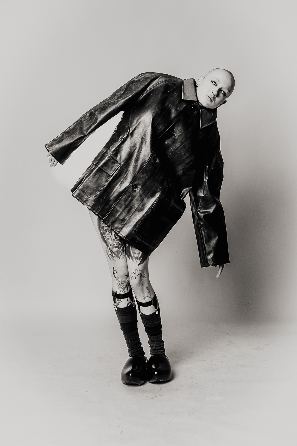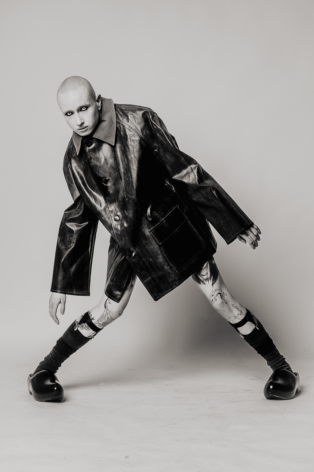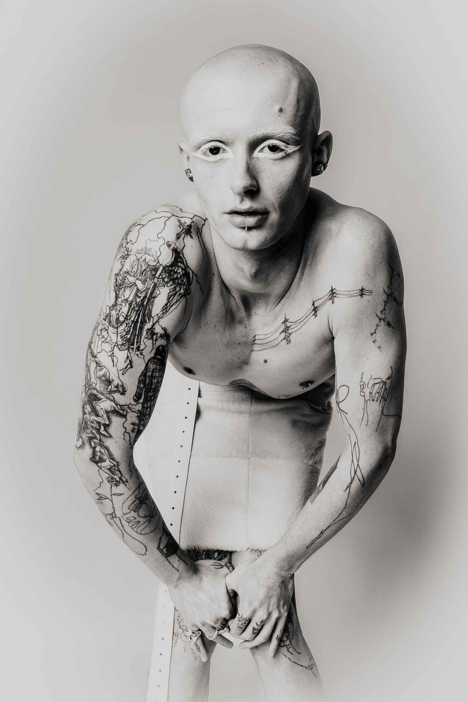 Shot against a neural studio backdrop, the series focuses on only on the body itself: tattooed, costumed, contorted, exposed. The models move through shifting states of vulnerability and power as fixed ideas of gender and beauty dissolve. What remains is something rawer and more honest: bodies that refuse to be legible on anyone else’s terms.