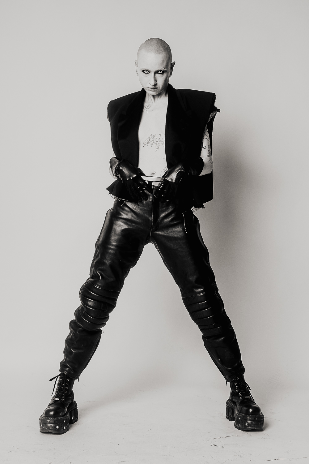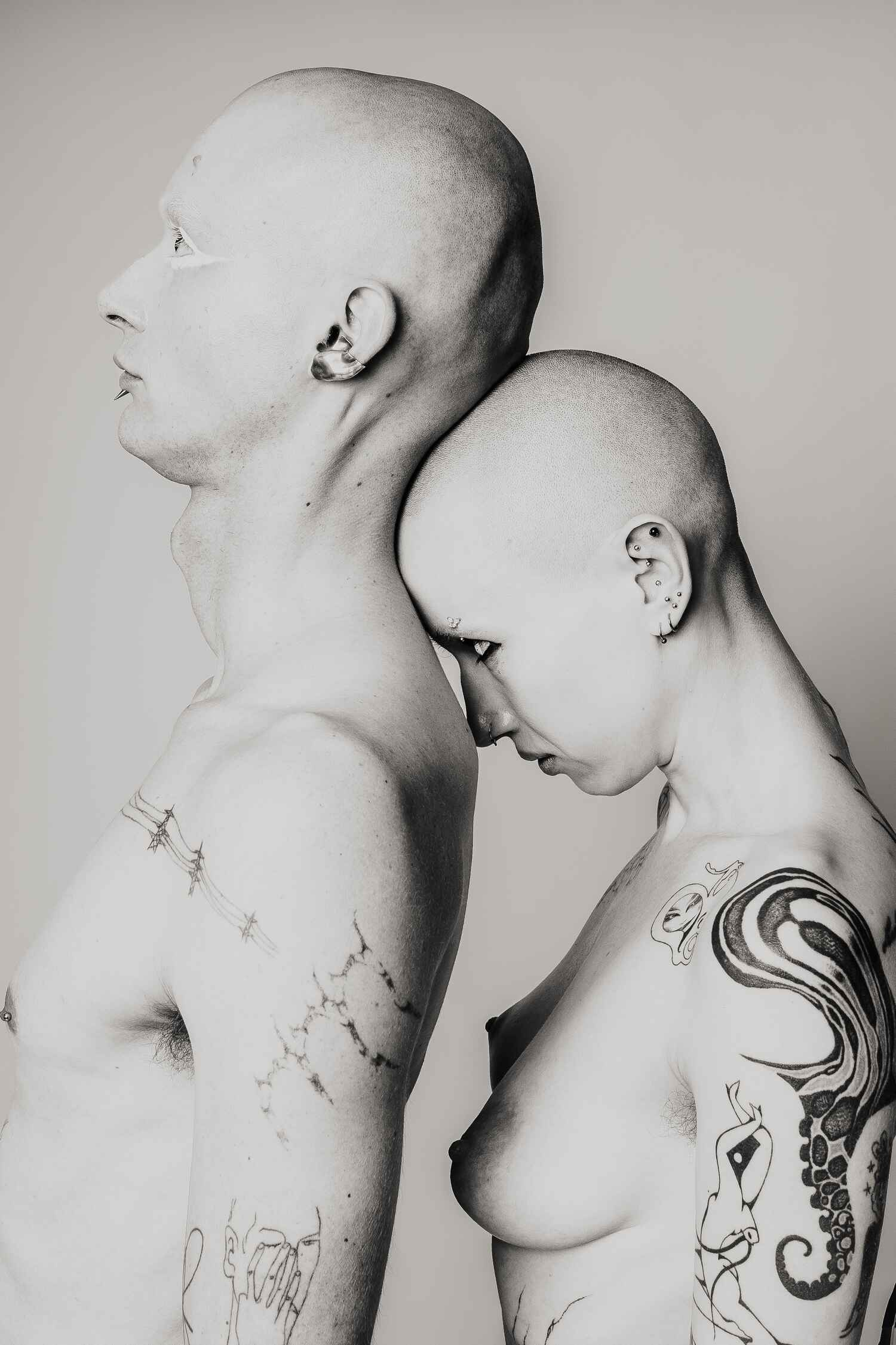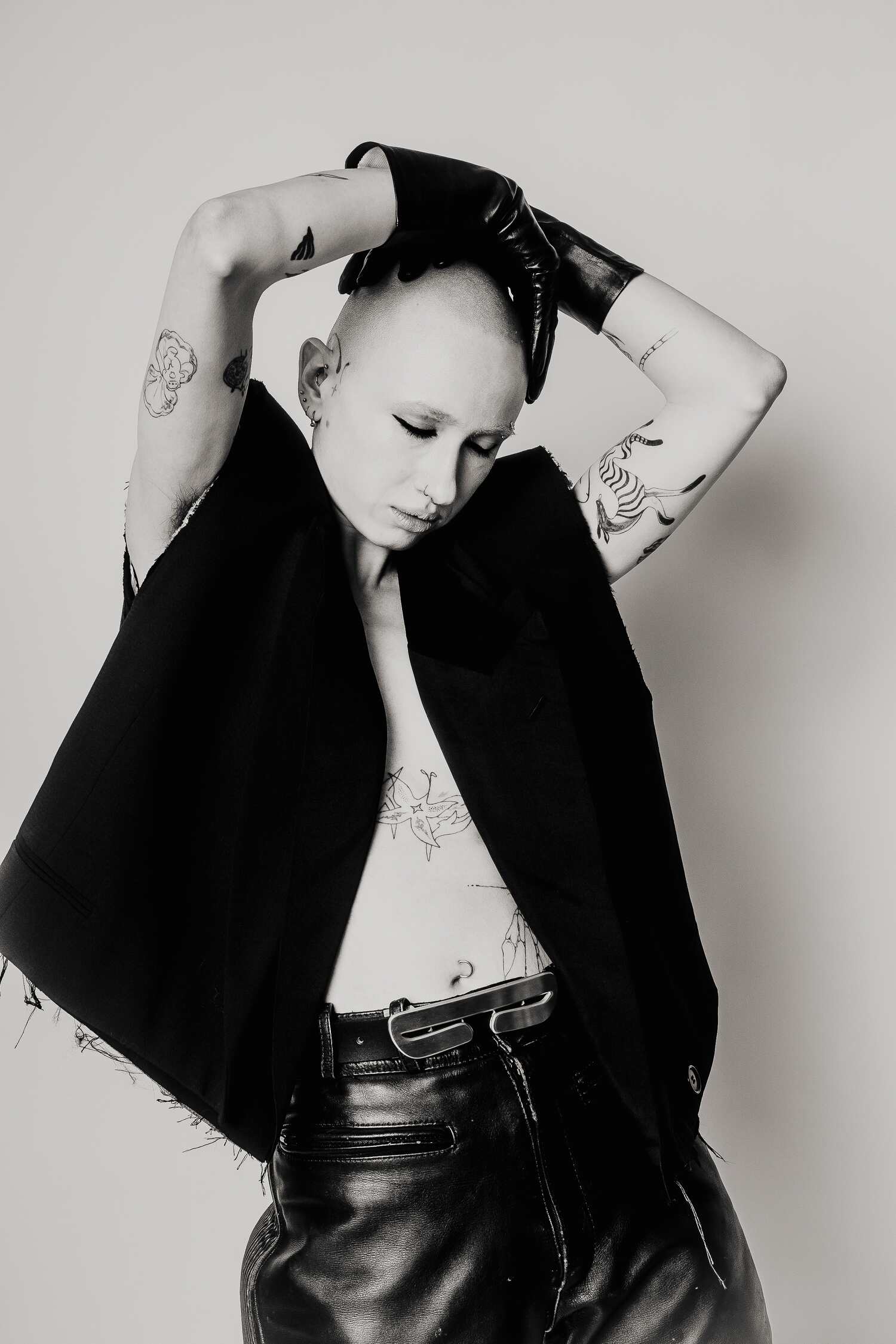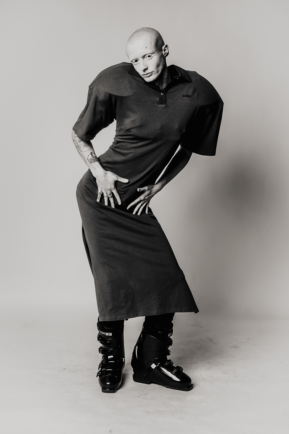 Shot against a neural studio backdrop, the series focuses on only on the body itself: tattooed, costumed, contorted, exposed. The models move through shifting states of vulnerability and power as fixed ideas of gender and beauty dissolve. What remains is something rawer and more honest: bodies that refuse to be legible on anyone else’s terms.