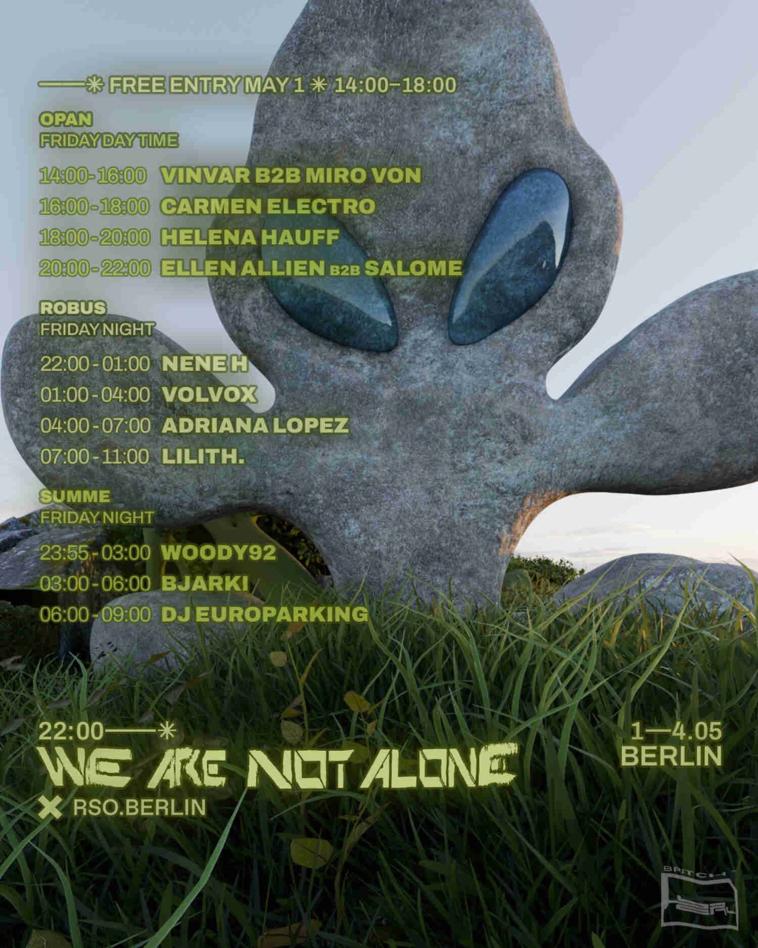 We Are Not Alone returns to RSO on May 1st for a Mayday weekender running through to Monday morning. The four-day program unfolds across ROBUS, SUMME, and OPAN, presenting a continuous exploration of underground electronic music. Each floor develops its own identity while remaining part of a unified club experience.