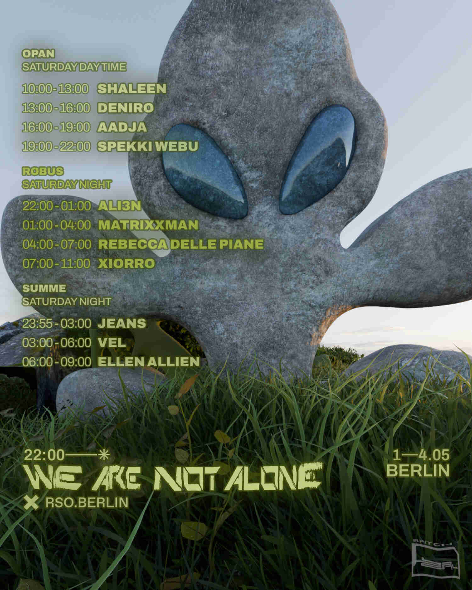By Monday morning, We Are Not Alone concludes not as a sequence of separate events but as a continuous immersive environment. Across ROBUS, SUMME, and OPAN, the weekend forms a unified structure shaped by contrast, endurance, and progression. Under Ellen Allien’s vision, We Are Not Alone becomes a sustained exploration of contemporary club culture that moves fluidly between intensity and openness.